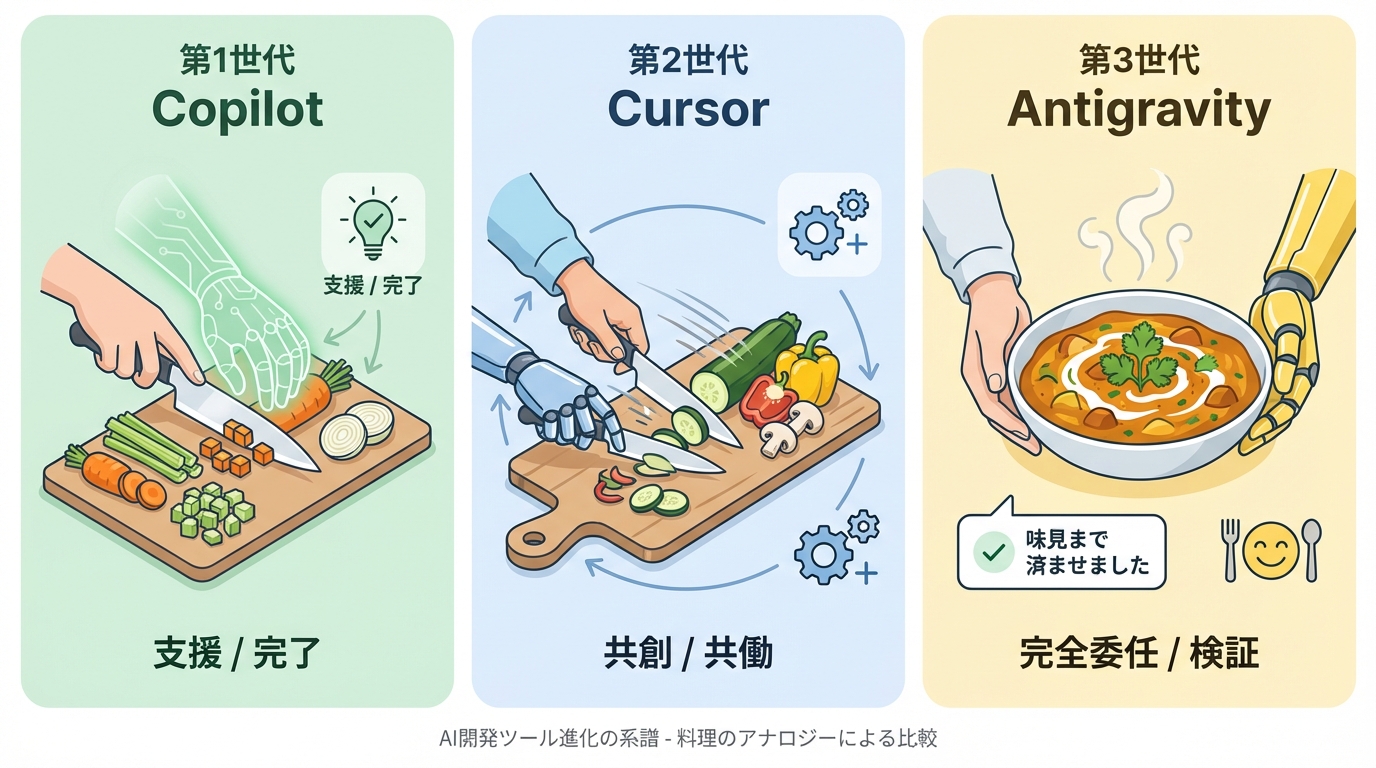 Antigravityを「ブラウザ操作まで自動でやってくれる、マネージャー機能付きのエディタ」と定義し、従来のAIツール(Copilot、Cursor)との違いを料理の例え(補完、共創、代行)で説明します。
