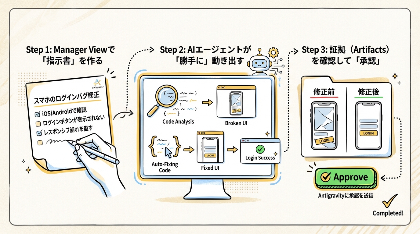 「スマホでログインボタンが押せないバグ」を例に、Antigravityの具体的な3ステップ(Manager Viewで指示書作成、AIエージェントが自動で調査・再現・修正・検証、Artifactsで確認・承認)での修正フローを解説します。