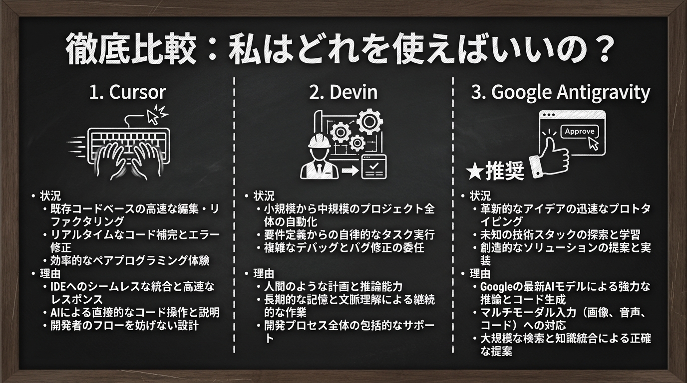 Cursor、Devin、Antigravityの3つのAIツールについて、ユーザーの状況別にどれを選ぶべきかの比較チャートを提供します(Cursorは自分で書きたい人、Devinは開発リソース不足のPM向け、Antigravityはチーム開発で雑務を任せたい人向け)。